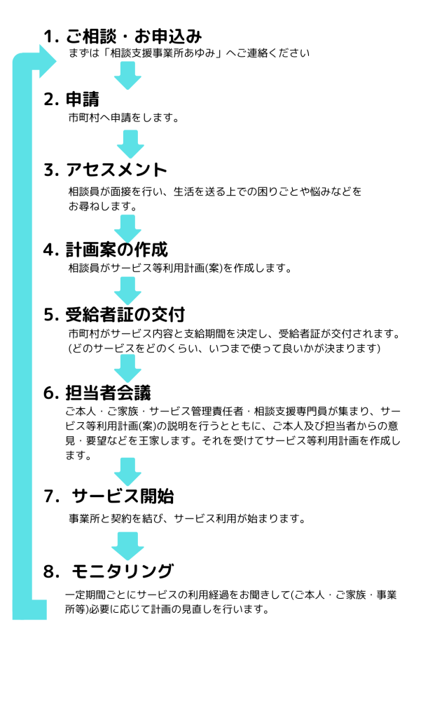 障がい福祉サービスを利用しようとしても、やり方が分からない、誰に相談したらいいか分からない、自分にあった対応をしてもらえないといったお悩みを利用者さんやご家族からよく聞きます。相談支援事業所あゆみでは、「障がいがあっても地域の中でその人らしく安心して生活していくこと」を見据えて支援します。1人1人の状況やこれまでの人生背景をお聞かせいただきながら、その人に合った障害福祉サービスをつなぐ橋渡しをさせていただきます。不安や心配がありお困りの際は、いつでもお気軽にご相談くださいね。みなさまからのご相談をお待ちしております。